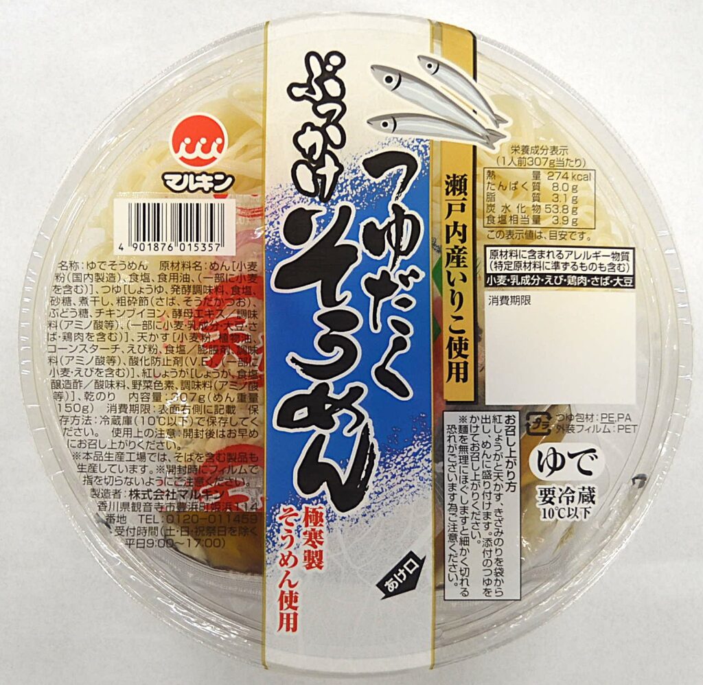 自社製造のそうめんに瀬戸内海産いりこだしつゆが付いた調理麺です。