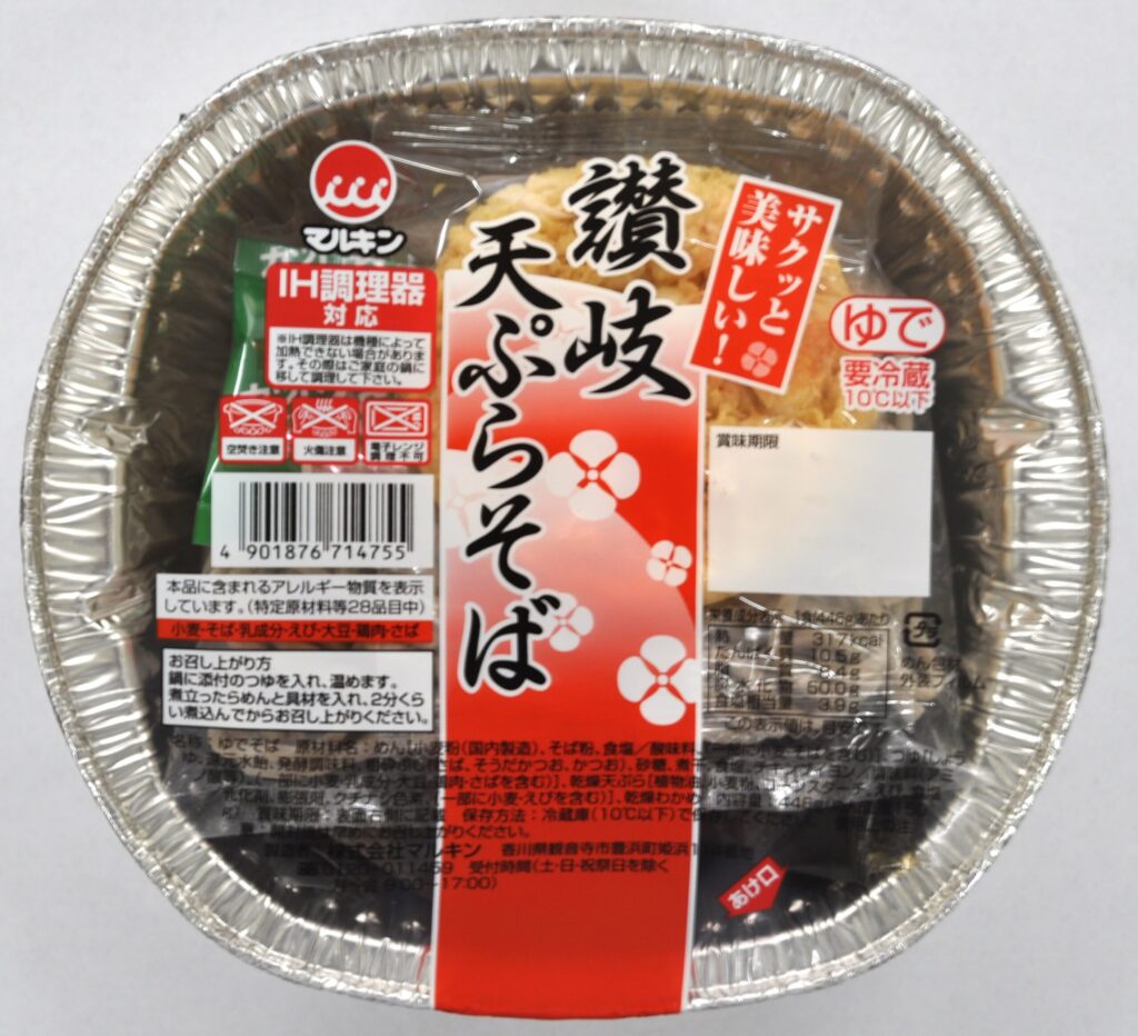 めん[小麦粉(国内製造)、そば粉、食塩/酸味料、(一部に小麦・そばを含む)]、つゆ[しょうゆ、還元水飴、発酵調味料、粗砕ぶし(さば、そうだかつお、かつお)、砂糖、煮干、食塩、チキンブイヨン/調味料(アミノ酸等)、(一部に小麦・乳成分・大豆・鶏肉・さばを含む)]、乾燥天ぷら[植物油、小麦粉、コーンスターチ、えび、食塩/乳化剤、膨張剤、クチナシ色素、(一部に小麦・えびを含む)]、乾燥わかめ